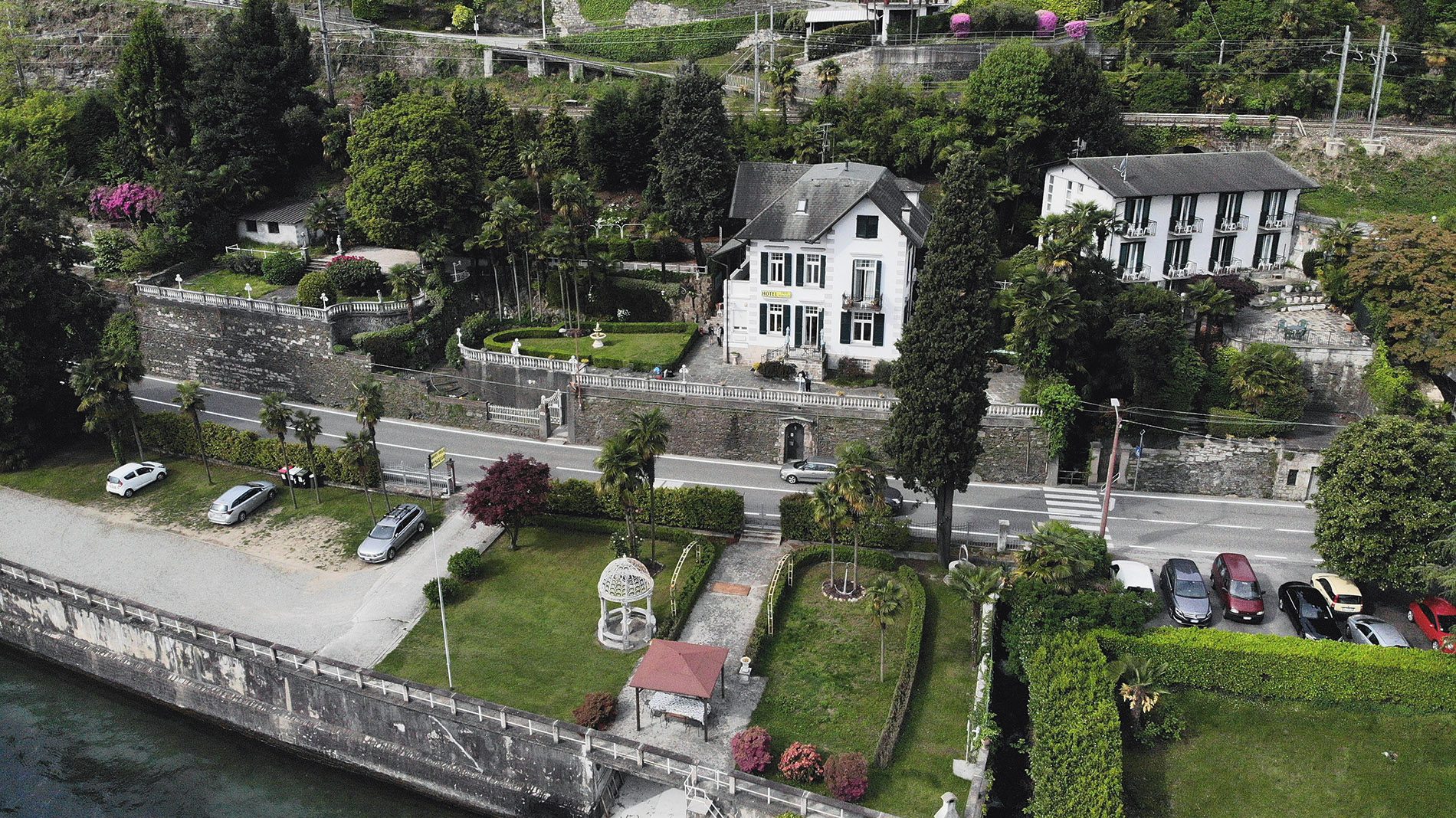 L’albergo si trova proprio di fronte ad lago, dal quale è separato dalla strada statale del Sempione.